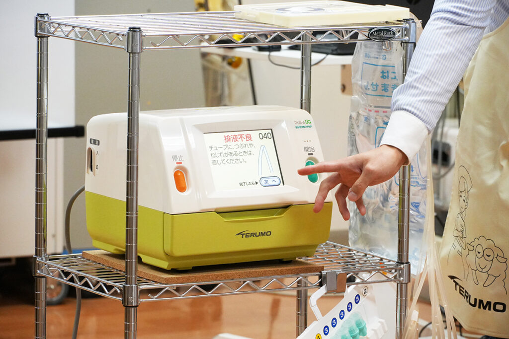 実演では実機を使用し、お腹に接続用のチューブがついている患者さんの使用状況を模したエプロンを用い、操作方法を含めて間近で見ることができました。