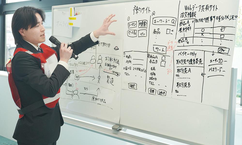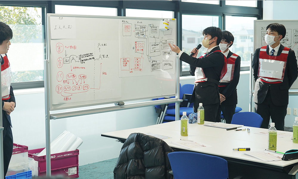 前半は産学連携授業として、業務の一部をITによって効率化する流れを、グループワーク形式で体験させていただきました。実際の業務をイメージしながら、「どこに課題があるのか」「どのような流れにすればより分かりやすく、より効率的になるのか」を考え、フロー図や画面遷移図へ落とし込んでいきます。学生たちは最初こそ難しさに悩みながらも、グループ内で意見を出し合い、少しずつ考えを整理しながら形にしていきました。