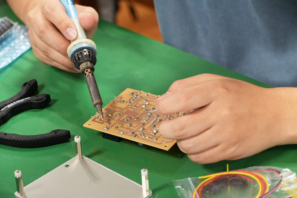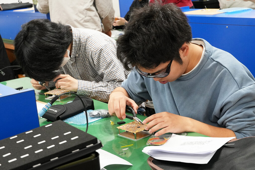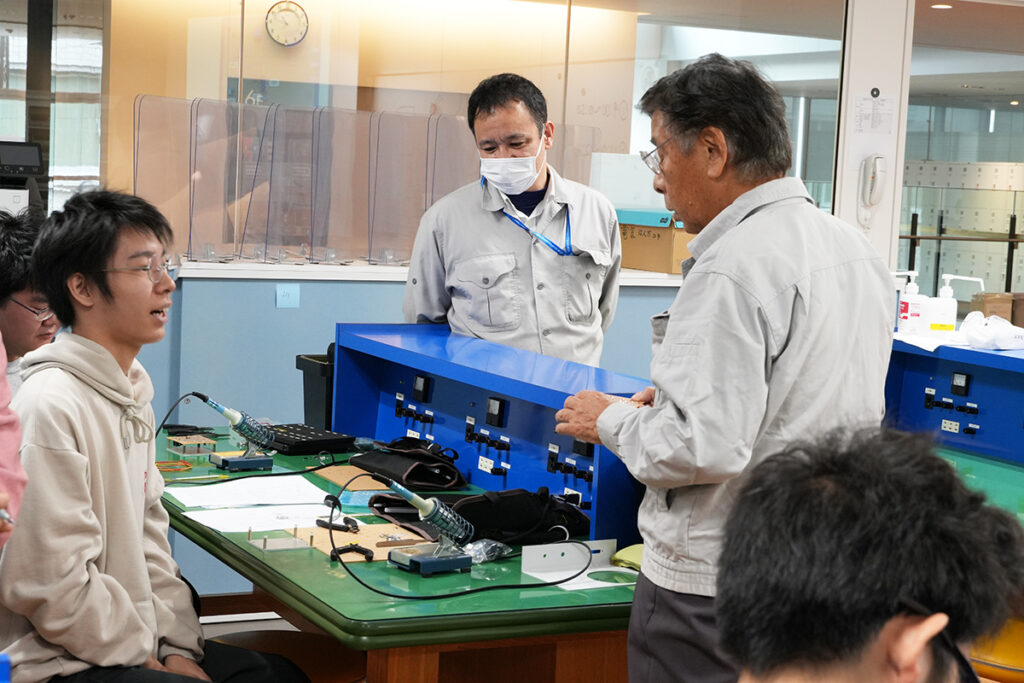 当科では「ものづくり実習」にこの制度を活用し、高い技能と豊富な指導経験をもつ「ものづくりマイスター」に講義を依頼することで、技能検定3級取得レベルの「はんだ付け技術」や「組立技術」を学ぶ「実践授業」を展開しています。