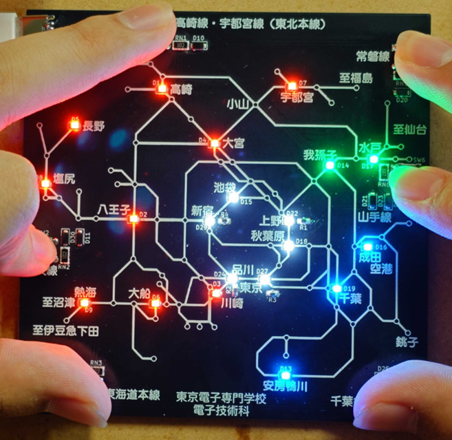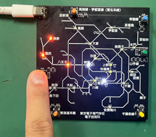 「電子工作体験」では、学生が企画・設計した電車の路線図基板を来場者の方に作ってもらいました。小学生から大人の方まで幅広い年齢層の参加があり、はんだづけの体験や電子回路の仕組みに興味を持たれる姿が印象的でした。初めてはんだごてを持つ方も多く、学生が丁寧にサポートしながら、安全に楽しく電子工作の魅力を伝えることができました。完成した作品がしっかり動作した瞬間には、喜びの声が上がるなど、会場全体が温かい雰囲気に包まれていました。