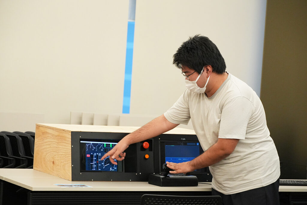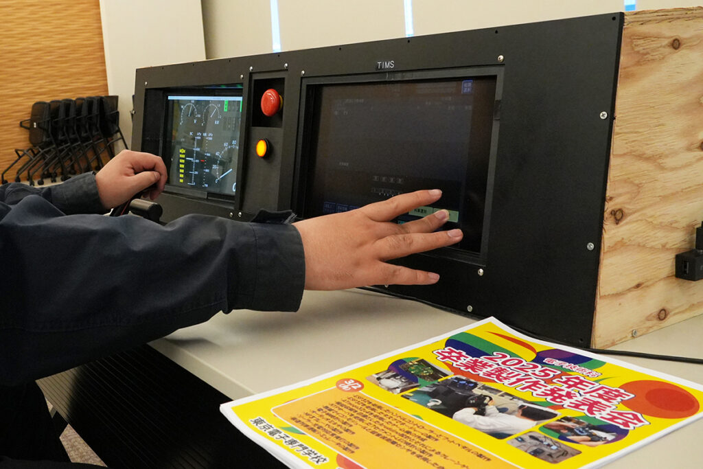 こちらの学生は「鉄道列車運転シミュレータ」を製作しました!(※手元のコントローラーは市販品です)