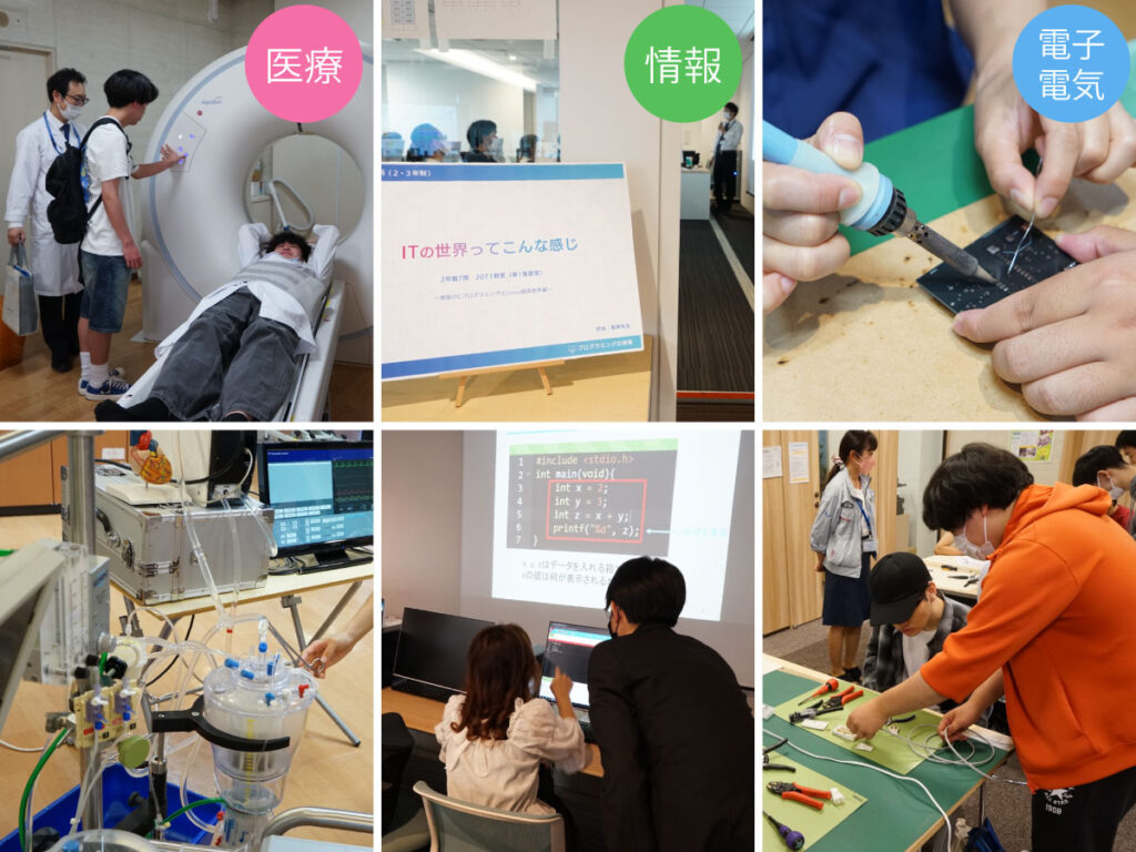 医療機器を使った健康チェックや業務体験、作品展示会、電子工作体験などの企画も。