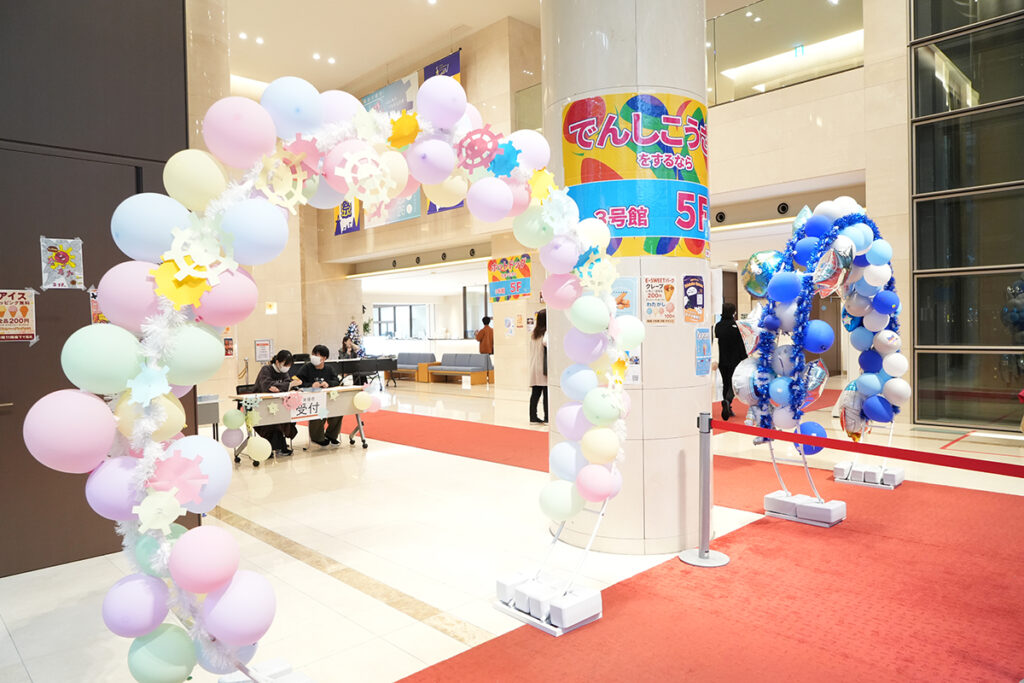 「TECCRAFT ~ひらめき、つながる未来~」というテーマのもと、技術を象徴する歯車が未来的な色合いでデザインされていて、学園祭中のキャンパスを彩りました。